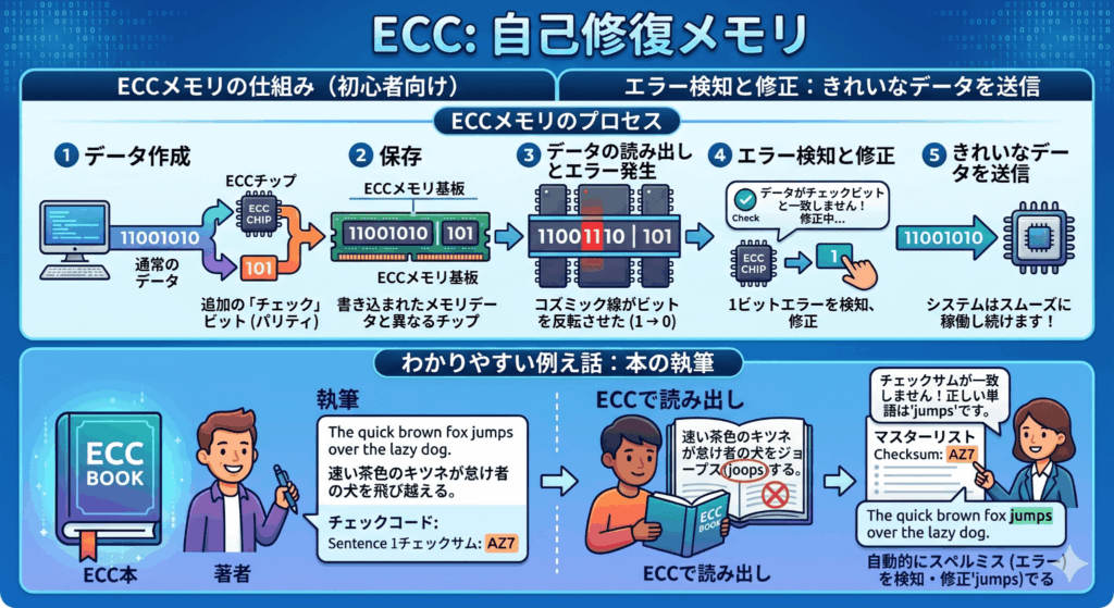 一方で、ECCメモリの場合は「あ、今データ間違ったな」と気付いて、裏でこっそり直してくる